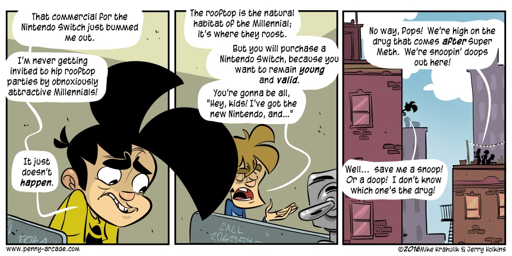 Something that is funny about the strip - if you're me - is that (as sometimes happens) we wrote the comic together, imagined that we agreed on its content, and then when he drew it Tycho literally sees the world in this way when I imagined that he was just fucking with his interlocutor. It's fine. It's cool. We'll make it through this somehow.